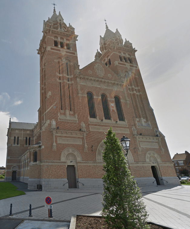 Après la Première Guerre mondiale, l’église de Merville est complètement détruite. La construction du nouvel édifice est confiée à Louis Cordonnier. La première pierre est posée le 13 avril 1924. Finalement, deux hautes tours carrées, surmontées d’une calotte byzantine, trônent sur la place Bruël.