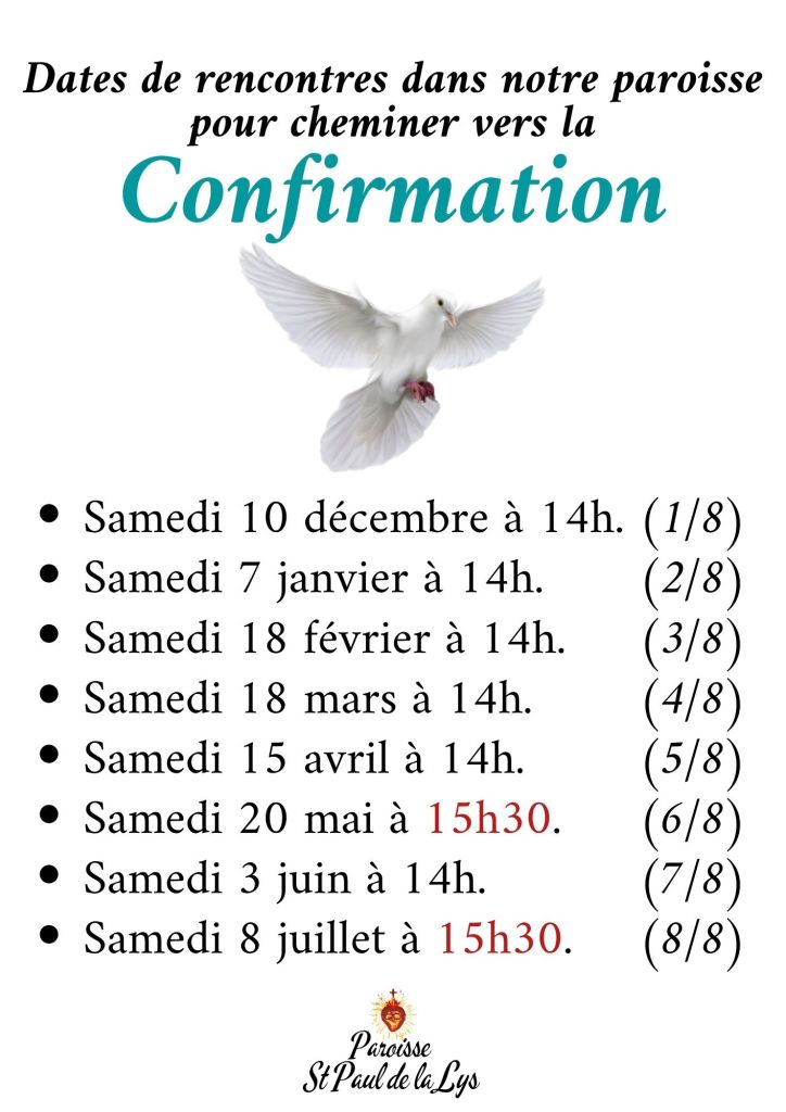- C’est habituellement aux jeunes des classes de troisième ou de seconde qu’est proposée la préparation à la confirmation. (Mais il est prévu de l’avancer)